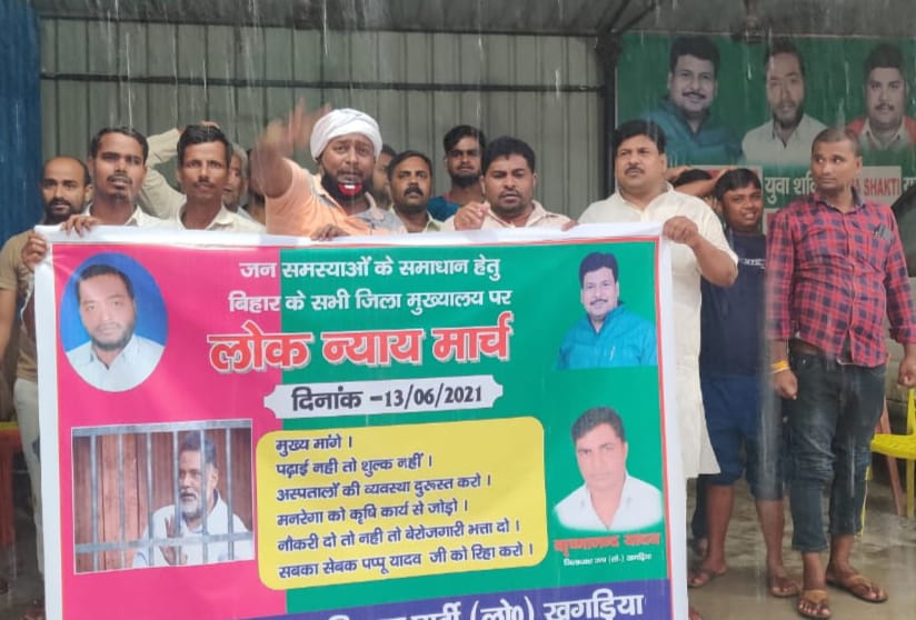राजेश सिन्हा बिहार में सियासी घमासान के बीच जनप्रिय पप्पू यादव की रिहाई सहित अन्य मसलों को लेकर जन अधिकार पार्टी के कार्यकर्ताओं का गुस्सा सातवें आसमान पर है।विभिन्न तरीकों से आंदोलन कर रहे जाप कार्यकर्ताओं ने रविवार अर्थात 13 जून 2021 को खगड़िया में न्याय मार्च निकाला।जन अधिकार पार्टी (लोकतांत्रिक) के जिला अध्यक्ष कृष्णानंद यादव के नेतृत्व में 5 सूत्री मांगों को लेकर निकाले गए न्याय मार्च के दौरान ‘जेल का फाटक टूटेगा पप्पू यादव छूटेगा,पढ़ाई नहीं तो फीस नहीं,महामारी कोरोना के कारण मौत के मामले में घोटाला करना बंद करो,मनरेगा को कृषि कार्य से जोड़ना होगा,बेरोजगारों की जो बात करेगा,वही बिहार पर राज करेगा’ इत्यादि नारे बुलंद किए जा रहे थे। स्थानीय कृष्णापुरी बलुआही स्थित जन अधिकार पार्टी लोकतांत्रिक के जिला कार्यालय से निकले दर्जनों कार्यकर्ता पार्टी का बैनर लिए मूसलाधार बारिश में भी डटे नजर आ रहे थे।शहर के विभिन्न मार्गों का भ्रमण करते हुए बलुआही गांधी पार्क चौक पर पहुंचे कार्यकर्ताओं द्वारा सभा आयोजित कर सरकार की बखिया उधेड़ी गई। पूर्व नगर सभापति सह जाप (लोकतांत्रिक) के प्रदेश महासचिव मनोहर कुमार यादव ने कहा कि जिस प्रकार बिना किसी ठोस कारण के गरीबों की आवाज सेवक पप्पू यादव जी को सरकार द्वारा जेल में बंद रखा जा रहा है, उससे संपूर्ण बिहारवासियों के बीच आक्रोश भड़क रहा है।उन्होंने कहा कि किसी भी परिस्थिति में बिहार वासियों को सिर्फ पप्पू यादव जी से ही आशा रहती है।उन्होंने चेतावनी देते हुए कहा कि बिहार सरकार पप्पू यादव जी को अविलंब रिहा करे।नहीं तो सरकार को गंभीर परिणाम भुगतने के लिए तैयार रहना होगा। युवा शक्ति के पूर्व प्रदेश अध्यक्ष नागेंद्र सिंह त्यागी ने कहा कि बिहार के प्राइवेट स्कूल संचालकों ने 2020 में लॉकडाउन अवधि का भी फीस जबरदस्ती लेने का काम किया था।जिसका परिणाम हुआ कि बहुत बच्चे पढ़ाई ही छोड़ दिए।इतना ही नहीं,फीस के नाम पर बच्चों को मानसिक रुप से प्रताड़ित भी किया गया।नतीजतन बच्चे मानसिक रोग का शिकार हो गए।श्री त्यागी के मुताबिक सरकार द्वारा प्राइवेट स्कूल संचालकों की इस मनमानी पर कोई कार्यवाही नहीं की गई। इसलिए इस बार जाप (लोकतांत्रिक)द्वारा पढ़ाई नहीं तो फीस नहीं के सवाल पर आवाज बुलंद किया जा रहा है।प्राइवेट स्कूल संचालकों की मनमानी के खिलाफ जाप द्वारा आर-पार की लड़ाई लड़ी जाएगी। जाप जिला अध्यक्ष कृष्णानंद यादव ने कहा कि खगड़िया जिला का स्वास्थ्य विभाग सिविल सर्जन के लिए दुधारु गाय बन चुकी है।उन्होंने कहा कि स्वास्थ्य विभाग लुटेरों के आतंक में डूबा हुआ है।उन्होंने कहा कि इस तरह का नजारा पूर्व में कभी नहीं दिखा था।उन्होंने स्वास्थ्य विभाग की व्