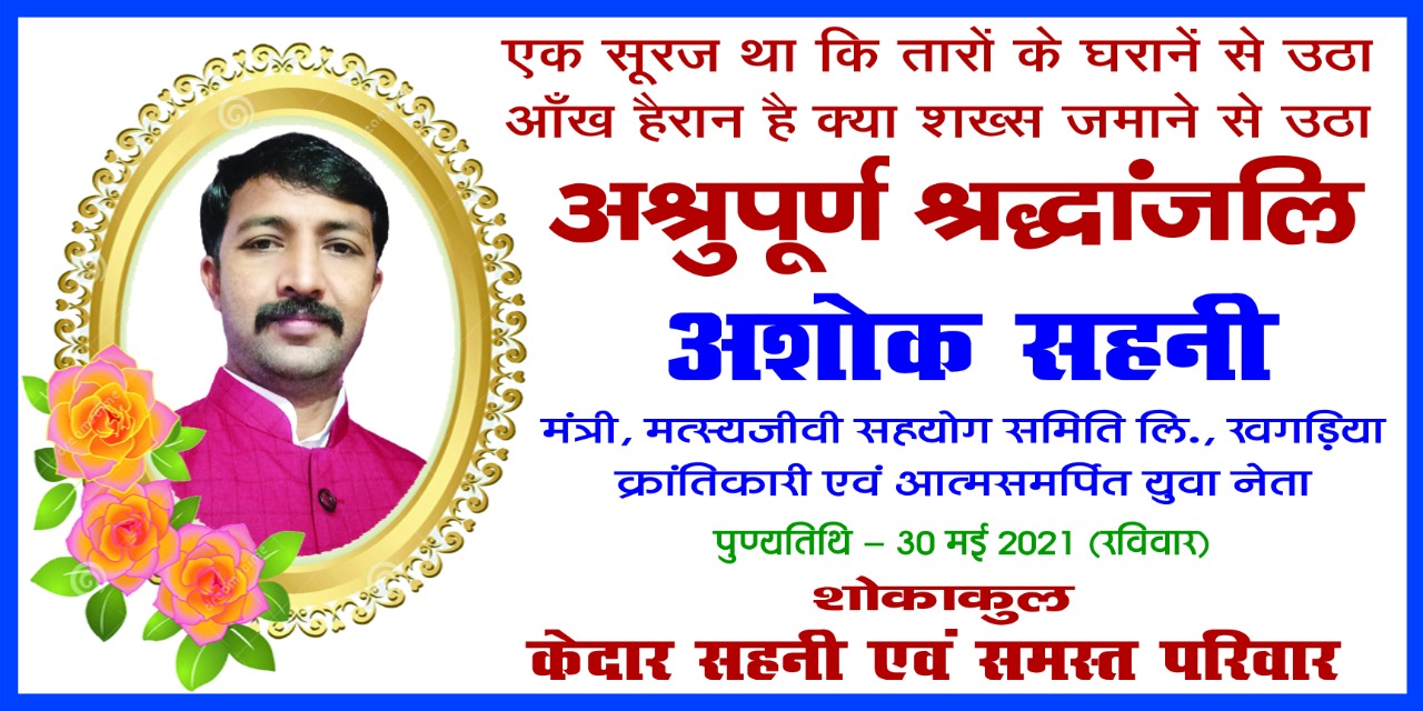 उनका लक्ष्य ही था गरीब और जरुरतमंद लोगों की मदद करना और रोजगार दिलाना।समिति के माध्यम से बहुत से गरीब परिवार के लोगों को रोजगार उपलब्ध कराकर समाज की मुख्य धारा में जोड़ने का काम उनके द्वारा किया गया था।दिवंगत मत्स्यजीवी सहयोग समिति मंत्री मुन्ना सहनी समाज में भी हमेशा सभी वर्गों के लोगों की मदद किया करते थे।Trusted News Portal and Youtube Channel कहीं किसी पदाधिकारी या नेता का किसी भी तरह का दिखे भ्रष्टाचार,तो मेरे वाट्सएप नंबर- 6200721661 पर मैटर,वीडियो और तस्वीर अवश्य डालें।खबर को प्राथमिकता मिलेगी।