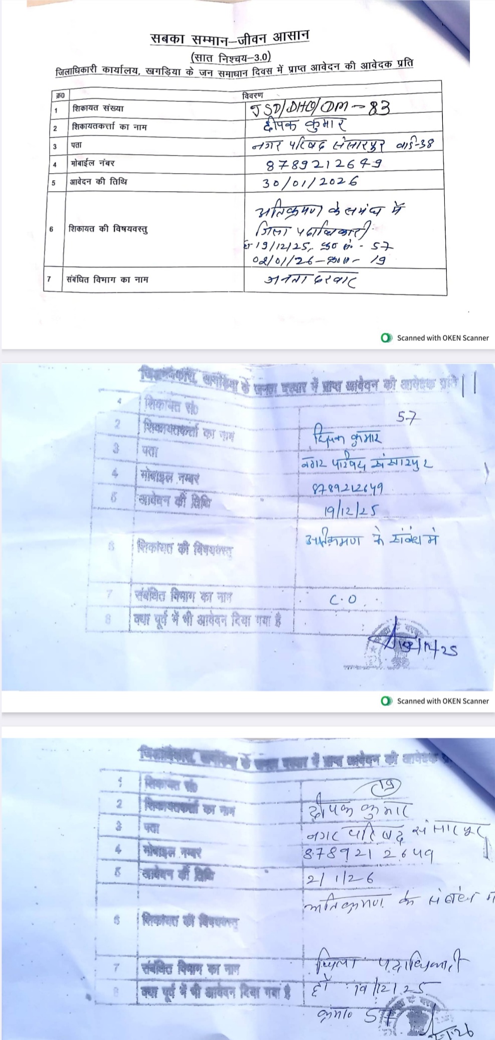 आरोप है कि कुछ लोगों ने इसे निजी उपयोग में ले लिया है। दीपक कुमार ने जिला पदाधिकारी के जनता दरबार में तीन बार आवेदन दिया—19 दिसंबर 2025 (आवेदन संख्या 57), 02 जनवरी 2026 (आवेदन संख्या 19) और 30 जनवरी 2026 (आवेदन संख्या JSD/DHQ/DM-83)।