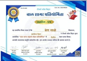 टीचर्स ऑफ बिहार द्वारा आयोजित “बाल सागर प्रतियोगिता” में खगड़िया की प्रतिभाशाली बेटी श्वेता साक्षी ने अपनी कहानी से निर्णायकों को प्रभावित करते हुए द्वितीय स्थान प्राप्त किया। इस प्रतियोगिता में गर्मी की छुट्टी के दौरान दी गई तस्वीर देखकर कहानी लिखनी थी, और श्वेता की रचना ने पूरे बिहार के शिक्षकों के बीच अपनी अलग पहचान बनाई।